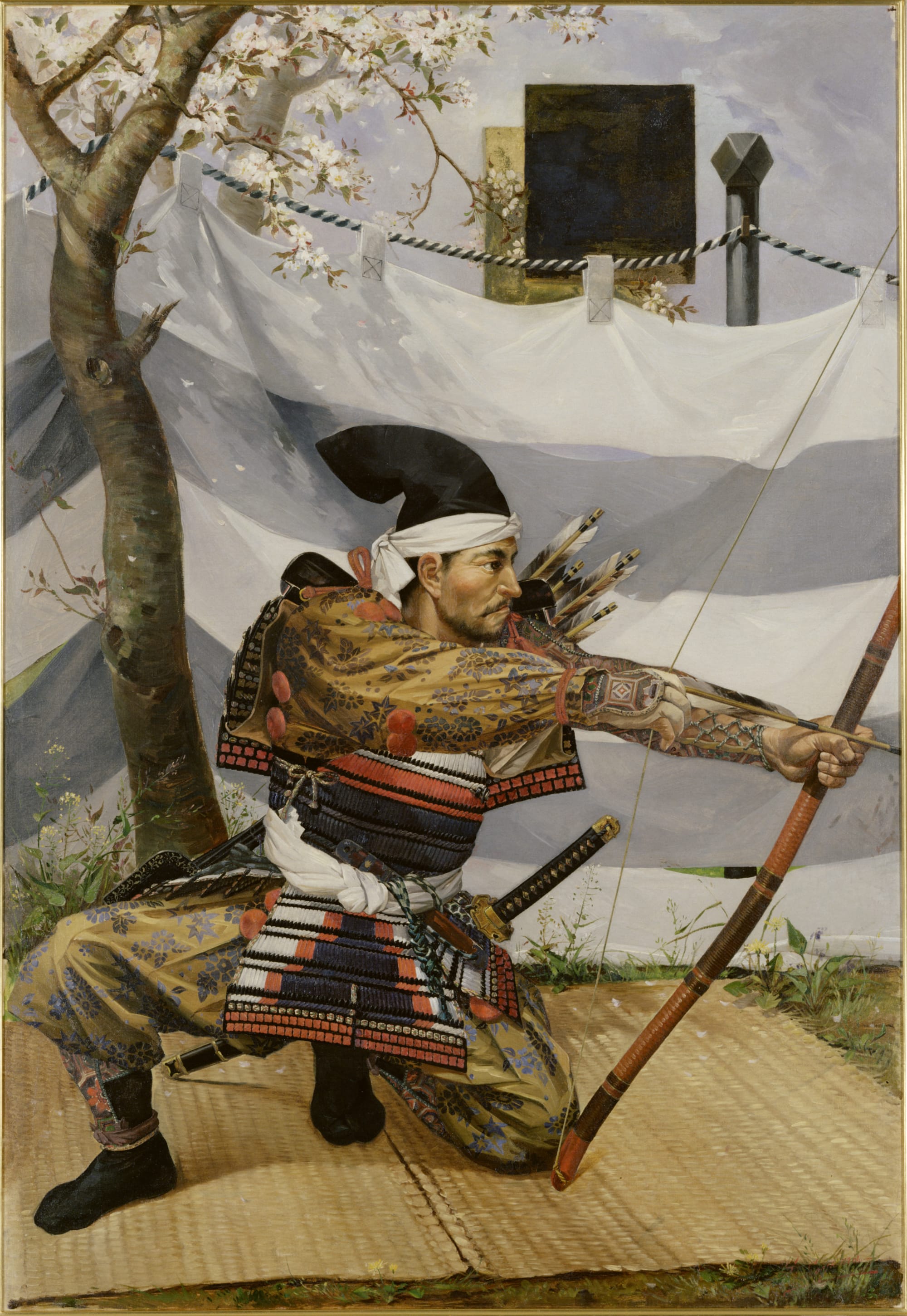 《試鵠》が描かれた明治20年代は、日本で西洋画が普及し始めた黎明期でした。弓を引く人物のモデルは薩摩藩の弓術家・東郷重持(とうごう しげもち)ですが、鹿児島市立美術館によると、その顔は作者である曽山自身の自画像であると伝えられています。