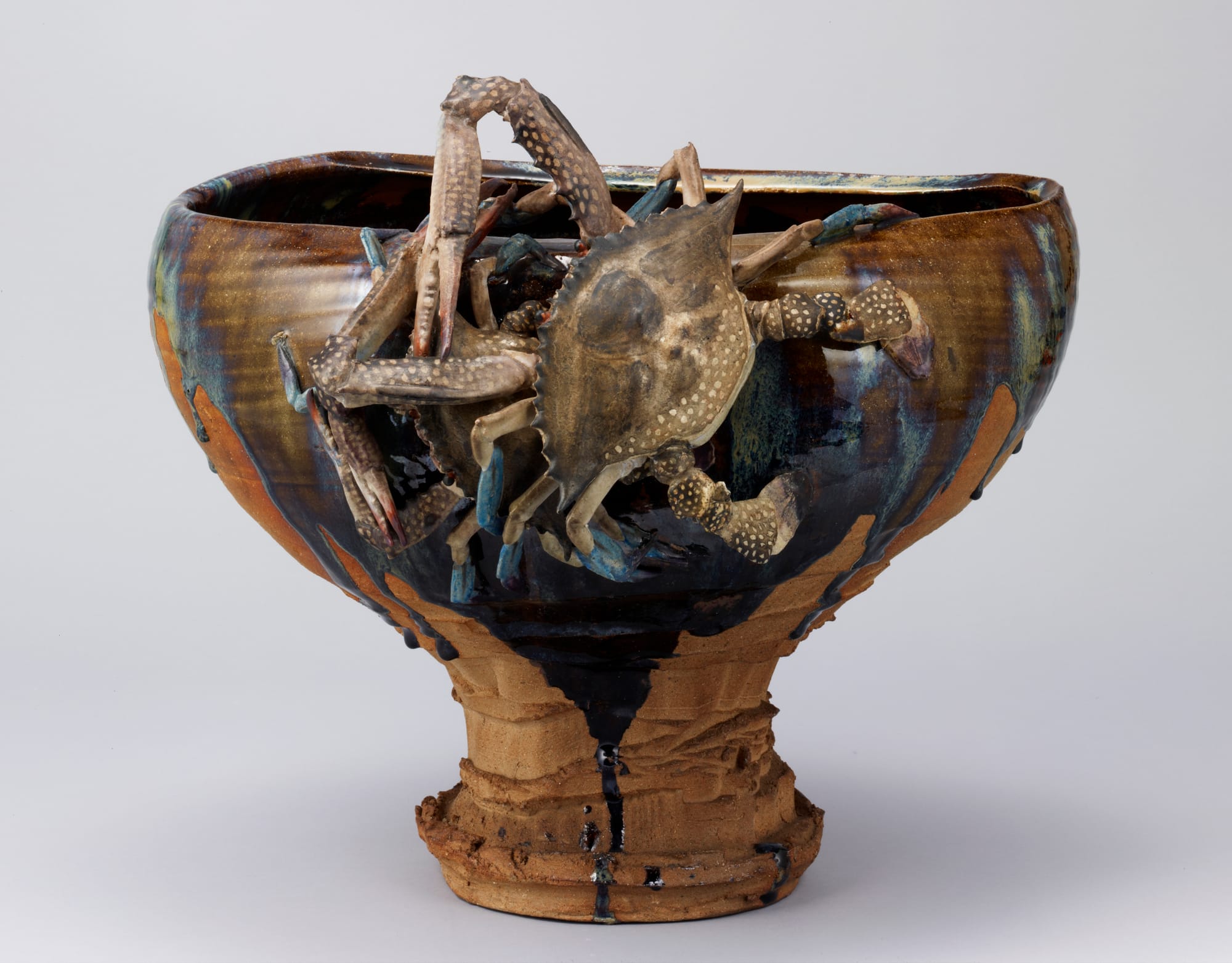 香山の名を知らずとも、あまりに精緻な蟹の造形に目を奪われ、思わずシャッターを切る来館者は後を絶ちません。歪みを持たせた壺に荒々しく施された釉薬。その上で、今にも動き出しそうな二匹のワタリガニ(blue crub)。実物のワタリガニと同じく、足先の青みや白い水玉模様まで忠実に再現されています。この装飾的で迫力あふれる作風は、当時の海外で熱狂的な人気を博しました。